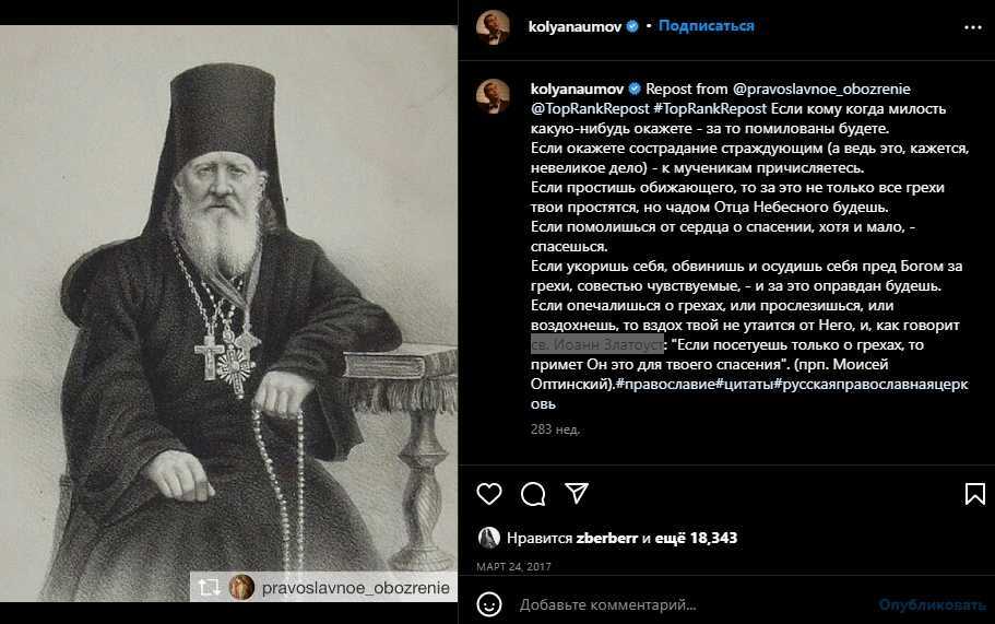 Так в 2017 году, к великому удивлению своих фанатов, он создал профиль в Инстаграм*, где по-прежнему опубликована только одна запись — цитата из наставления святителя Иоанна Златоуста о прощении.