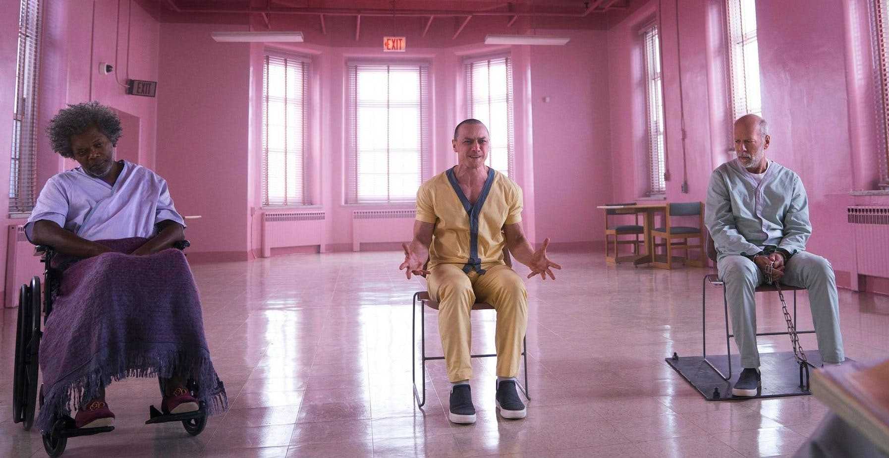 Сэмюэл Л. Джексон, Джеймс МакЭвой и Брюс Уиллис в фильме «Стекло»